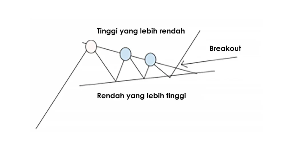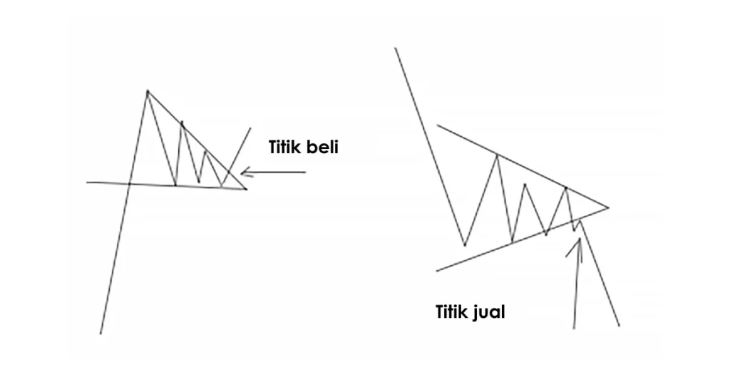 Corak ini menunjukkan kemungkinan besar penembusan akan berlaku. Walaupun arah harga belum pasti, dua posisi kemasukan boleh diletakkan — satu di atas paras puncak (paras rintangan), dan satu lagi di bawah paras lantai (paras sokongan).