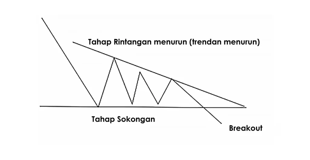 Corak kedua ialah baji menurun, iaitu corak yang bertentangan. Corak ini memberi isyarat potensi pembalikan arah atau kesinambungan arah yang sama. Jika corak menurun terbentuk selepas aliran menurun, keadaan ini mungkin membawa kepada aliran menaik. Sebaliknya, jika corak ini terbentuk dalam aliran menaik, harga mungkin akan terus bergerak dalam arah yang sama.
