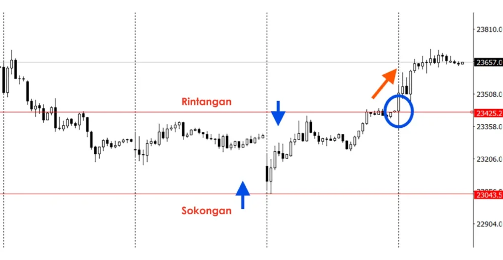 - Sekiranya volum rendah: Jika penembusan berlaku dengan volum yang rendah, situasi ini mungkin merupakan penembusan palsu (fakeout), iaitu harga mungkin berbalik arah atau bergerak mendatar serta kehilangan momentum penembusan.