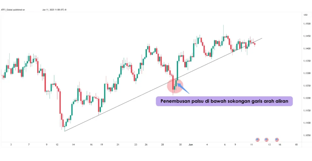 Walaupun garis trend yang dilukis dengan baik boleh dipecahkan, keadaan tersebut tidak semestinya menandakan bahawa trend telah berakhir. Kadangkala harga bergerak seketika menembusi garis trend, sama ada ke atas atau ke bawah, sebelum segera berbalik arah. Keadaan tersebut dikenali sebagai pecahan palsu, yang boleh mengelirukan pedagang dan mendorong mereka membuat keputusan secara tergesa-gesa.