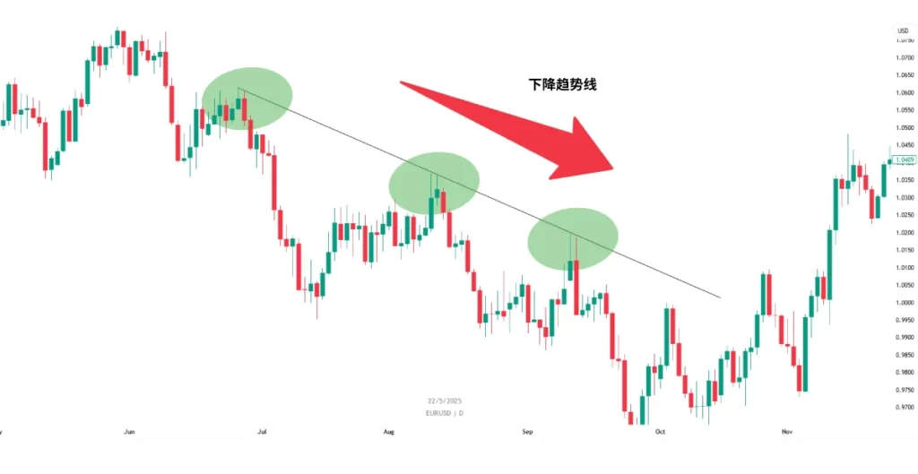 趋势线是连接图表上一系列价格点(高点或低点)的直线,以揭示市场的方向。