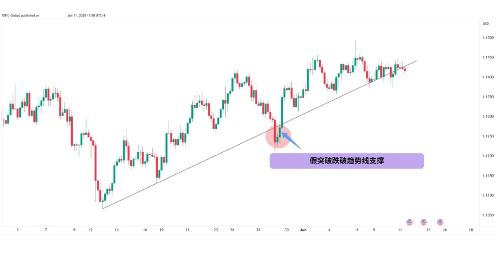 当价格短暂突破趋势线,然后又迅速回到原来的方向时,就会发生假突破。看起来趋势似乎正在逆转,但事实并非如此。这些假突破可能是由于短期波动、诱杀止损或突发新闻事件引起的。