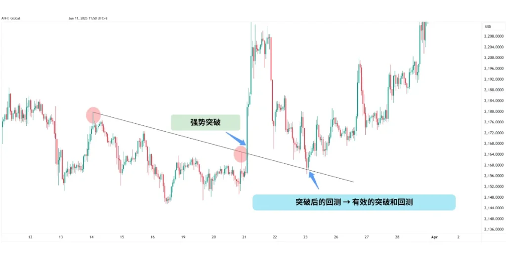 图3:强势向上突破趋势线,随后重新测试,表明入场点有效。