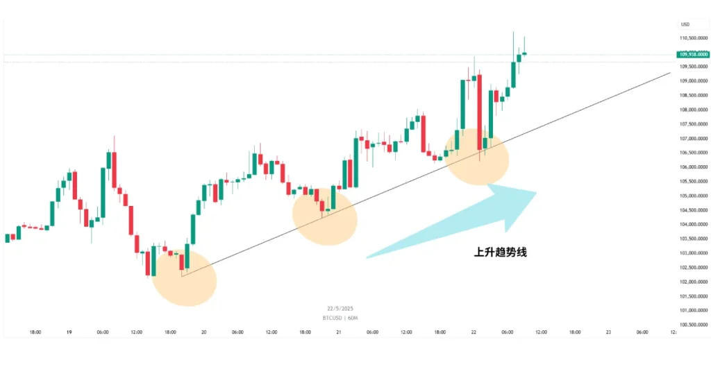 例子:在日线图上,你可以绘制一条向上倾斜的线,该线触及几个较高的低点,显示持续的购买压力。