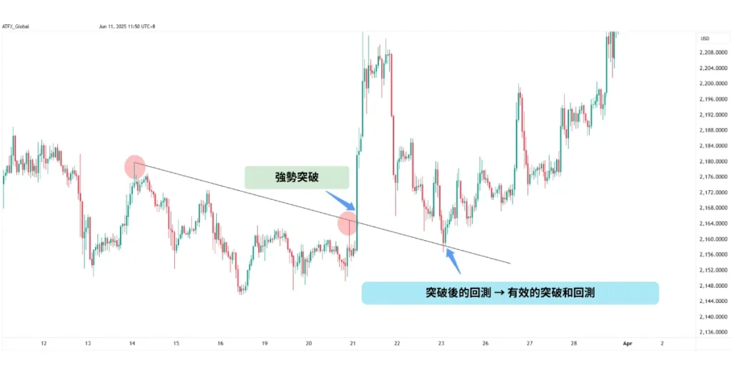 - 上升趨勢線突破後,形成較低的高點(或下降趨勢線突破後,形成較高的低點)