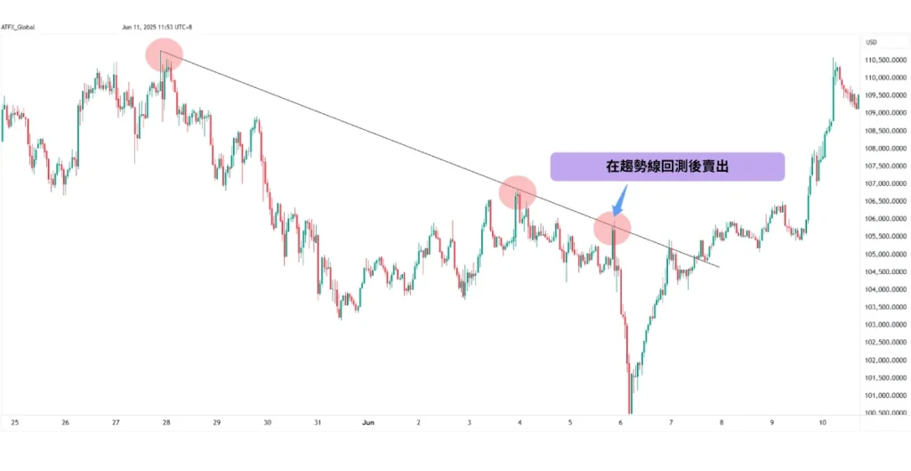 圖 1:下降趨勢顯示出在賣出機會之前重新測試趨勢線